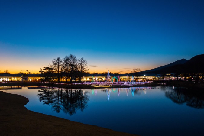 軽井沢・プリンスショッピングプラザで開催されるウインターイルミネーション。広大な敷地内に輝く幻想的な光が灯り、水面に映るイルミネーションと夕日のコントラストが美しいスポットとして人気です。冬の軽井沢の澄んだ空気の中で、ロマンチックな雰囲気を楽しむことができます。