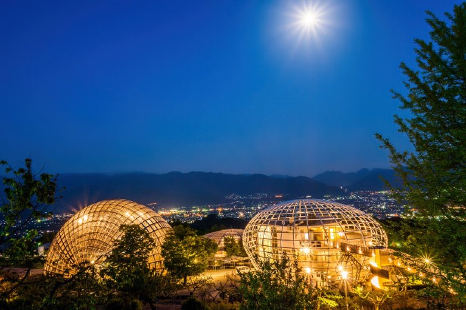 甲府盆地を一望できる丘陵地に整備された公園で、果樹園、温室、資料館、遊具施設が点在しています。園内からの夜景は「新日本三大夜景」に選ばれ、ライトアップされた温室ドームが前景を飾り、甲府盆地と背後にある富士山のシルエットが美しく映えます。また、各所に多様な植物が植えられ、四季折々の風景も楽しめます。