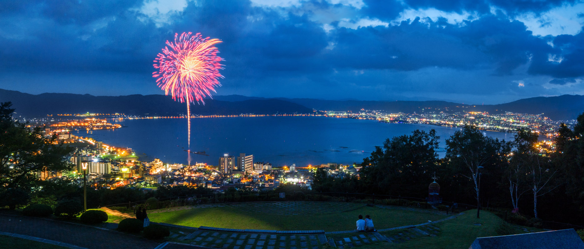 諏訪湖を一望できる絶景スポット。特に夕暮れ時には湖が茜色に染まり、周囲の街の明かりと共鳴するような美しい景色が広がります。園内には芝生広場や遊歩道が整備され、ゆったりとした時間を過ごせます。また、映画やドラマの撮影地としても利用されるなど、多くの人に親しまれています。