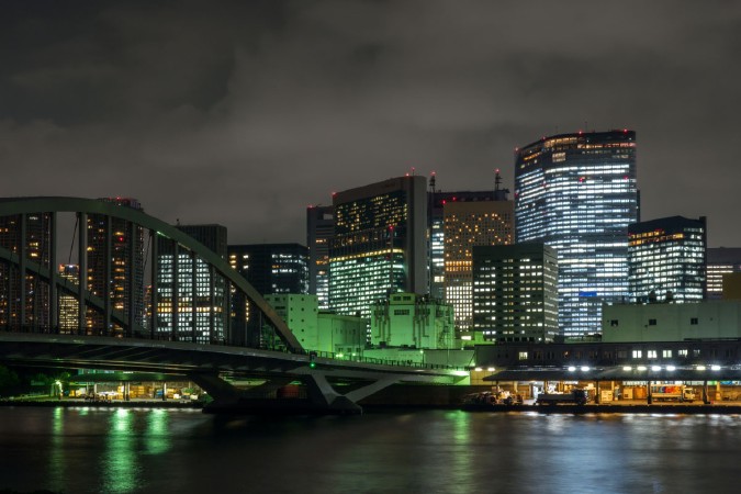 浜崎水門の近くに位置する隅田川沿いの遊歩道。静かな散歩に最適なロケーションで、築地大橋や勝鬨橋をはじめ、川沿いの高層ビル群や東京タワーを望むことができます。特に夜には、橋やビル群がライトアップされ、美しい夜の情景を作り出します。