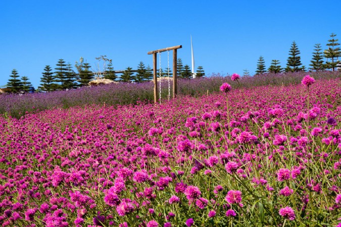 山の上にある花畑で、ゴンフレナ・ラブラブラブやバーベナが美しく並び、色鮮やかな景色を作り出しています。背景にはこの地域のウィンドファームの巨大な風車がそびえ立ち、ダイナミックな景観が広がっています。